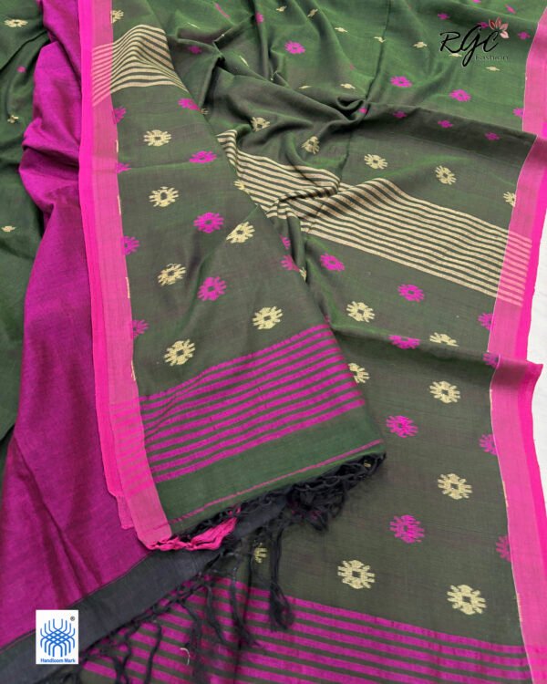 Dark Green Handloom Mulmul Cotton Triangle Jamdani Saree