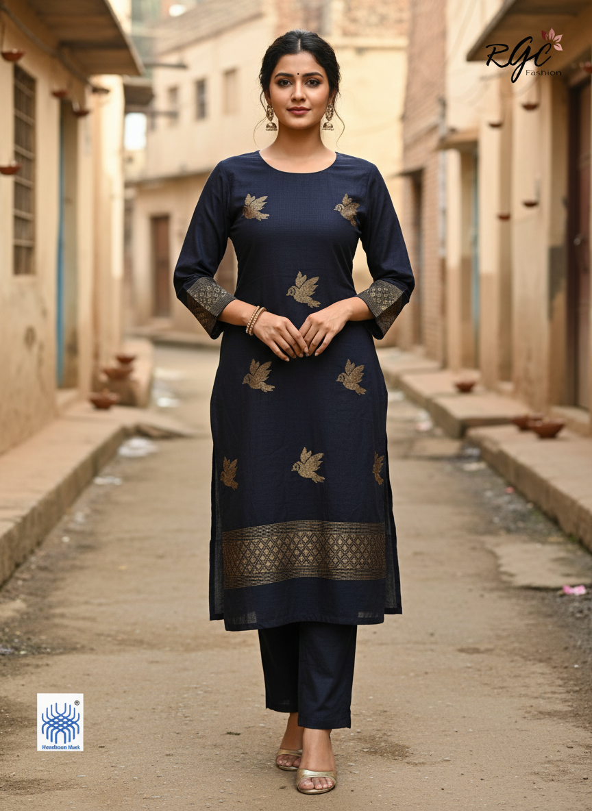 Navy Blue Premuium Mulmul Cotton Bird Jamdani Coord Suit Set