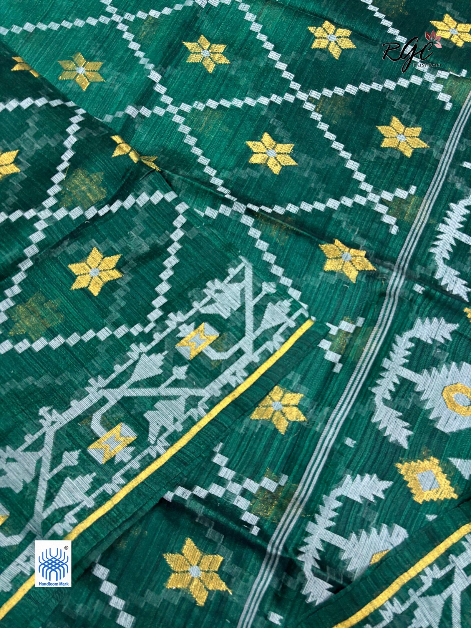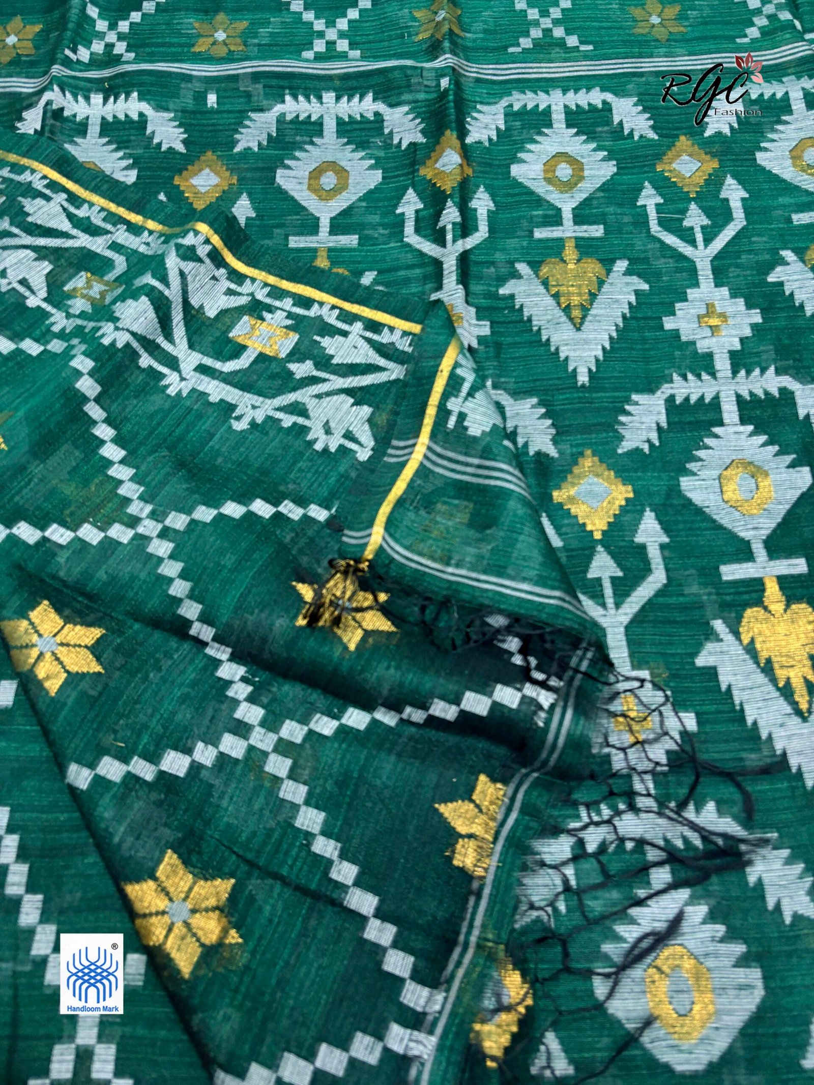 Bottle Green Handloom Resham Matka Allover Jamdani saree