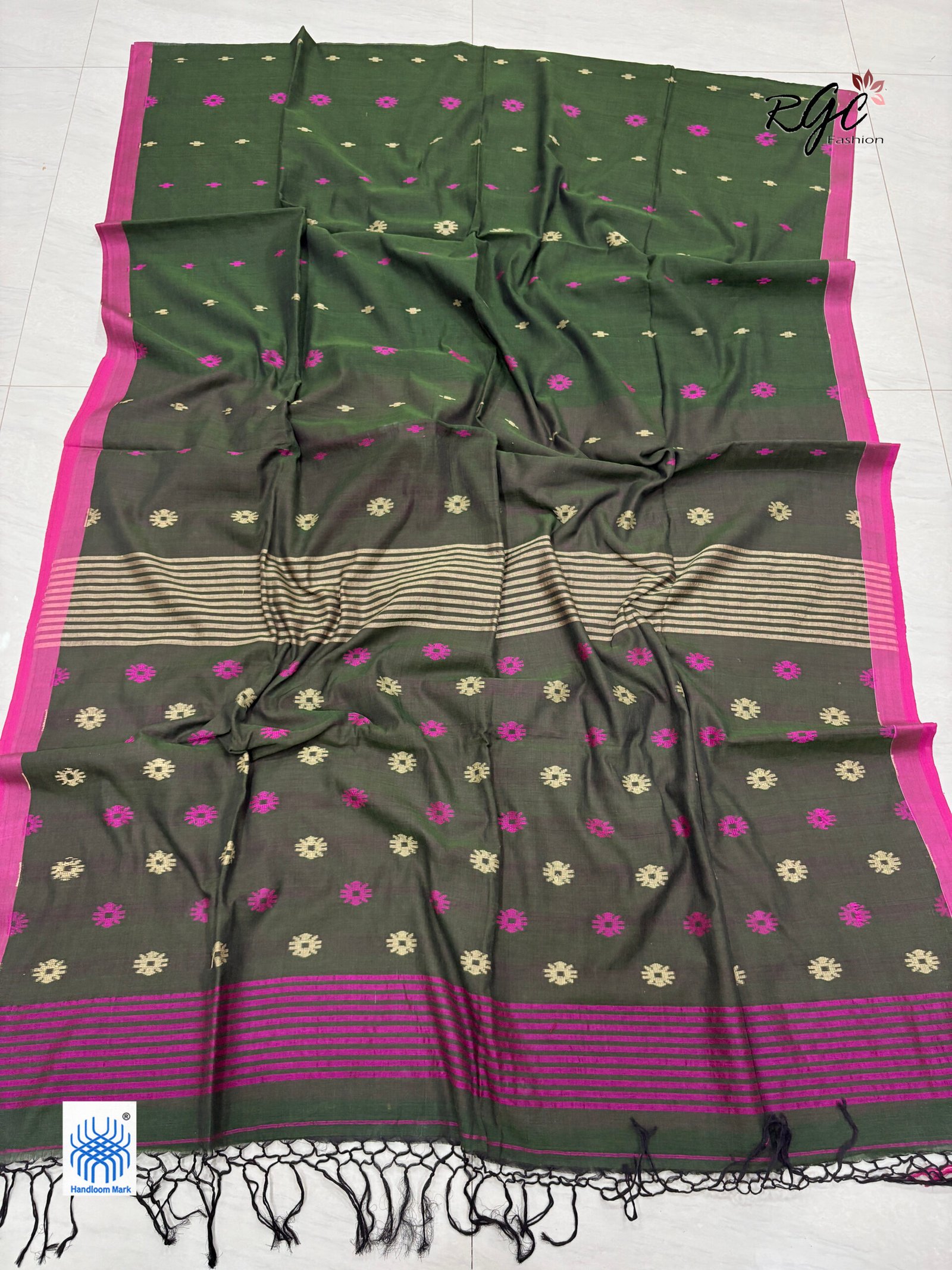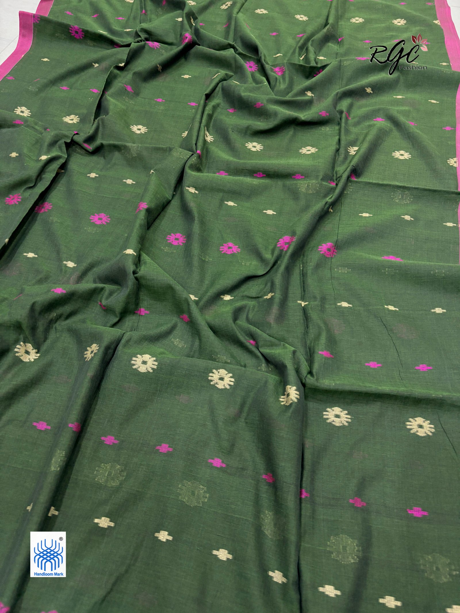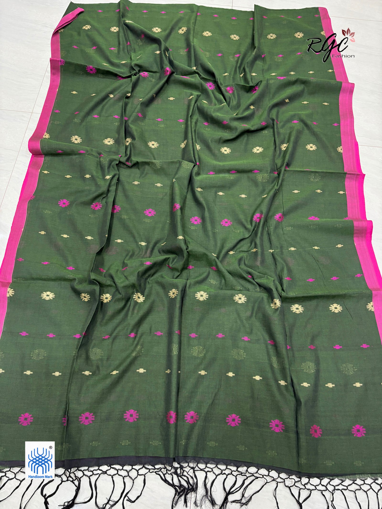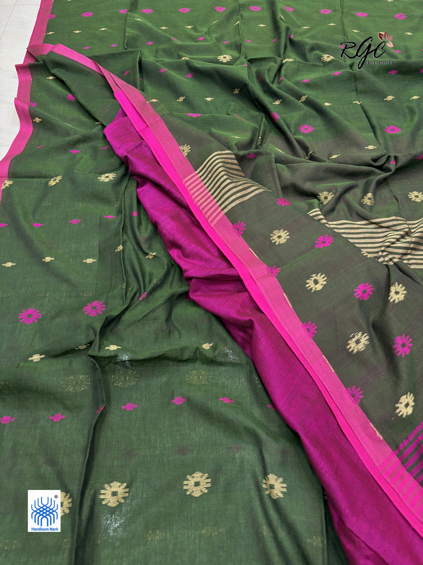 Dark Pista Handloom Mulmul Cotton Dhakai Jamdani Saree