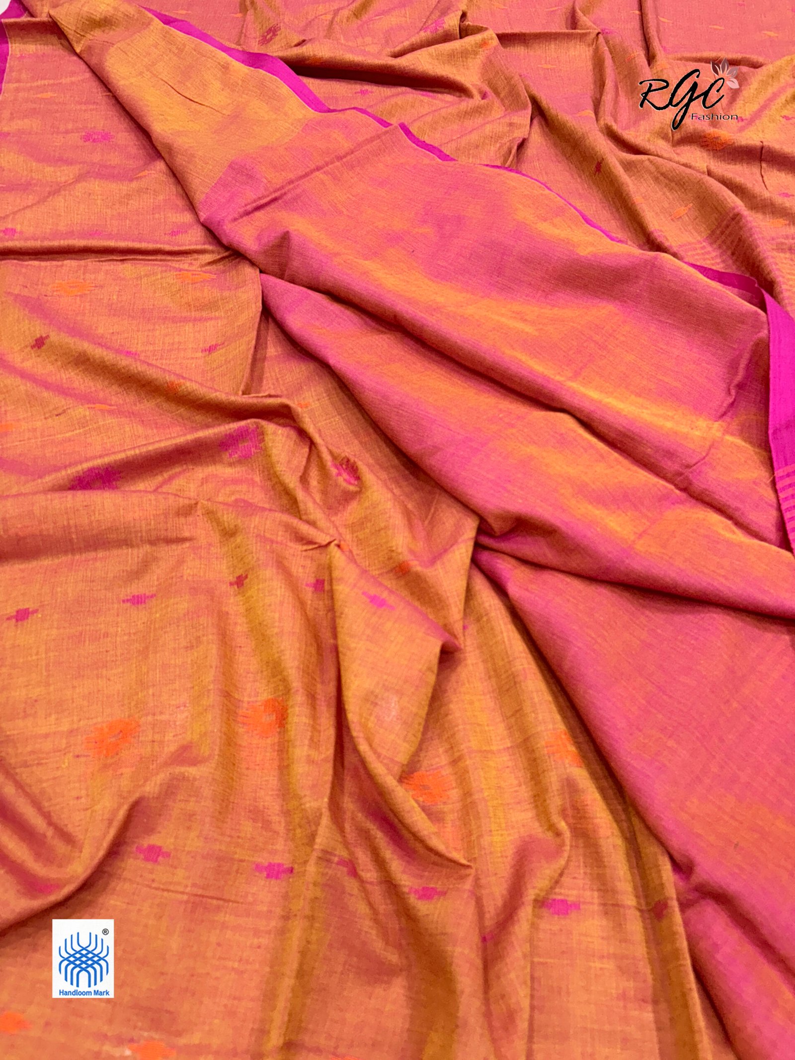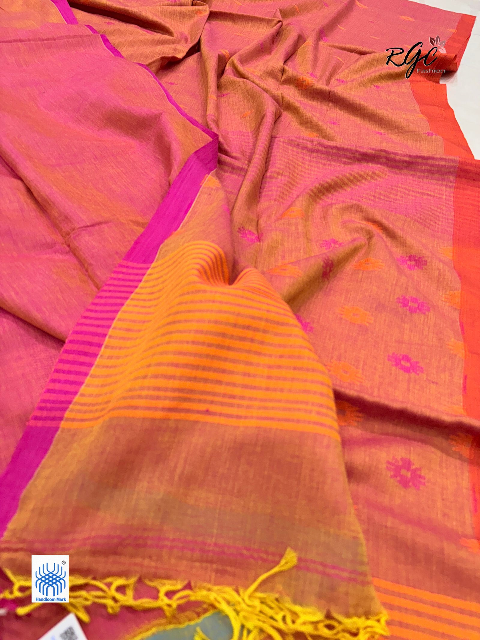 Pink Yellow Dual Tone Handloom Mulmul Cotton Dhakai Jamdani Saree